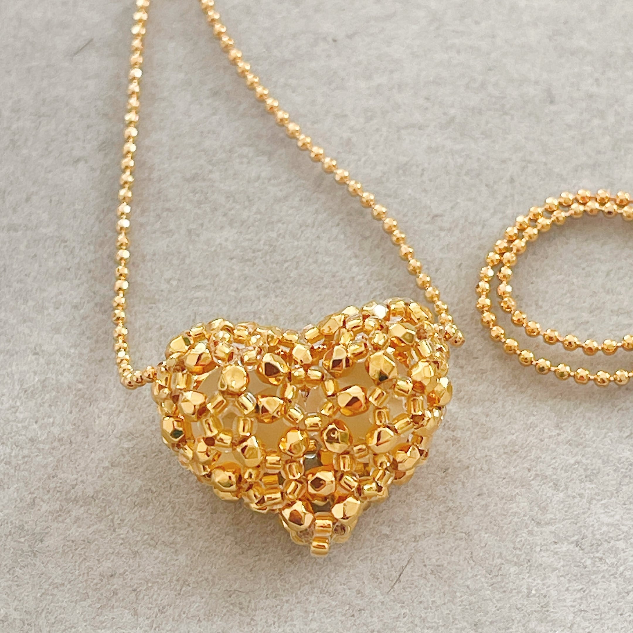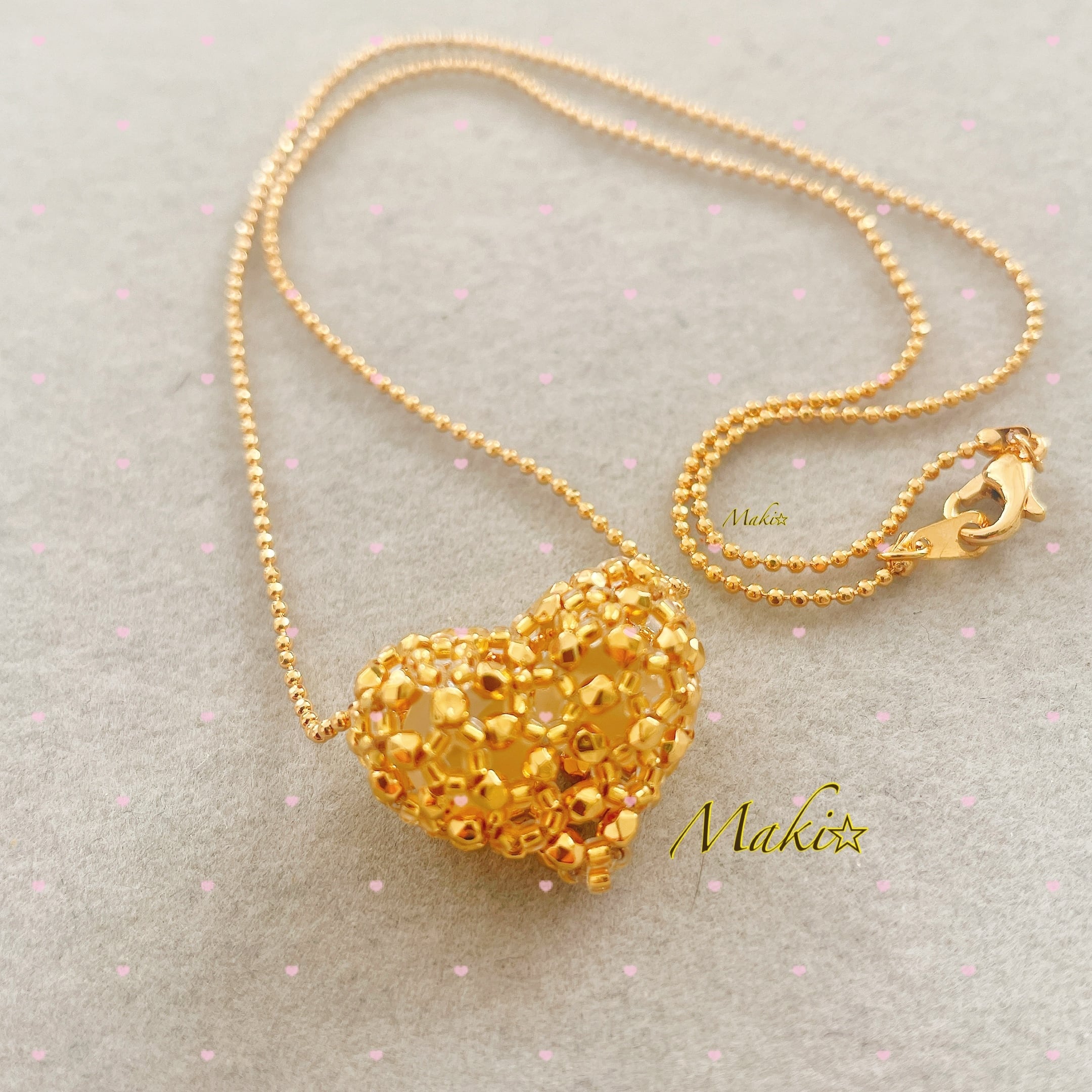 fragem作家maki☆ より 24kコーティングビーズと16kのネックレスをお届けします。 繊細に編み込まれたコロっとした可愛いハートのネックレスです。 アクセサリーを1つ纏うだけで気持ちも気分もテンションが上がります。 素敵なあなたへ素敵なアクセサリーを✨